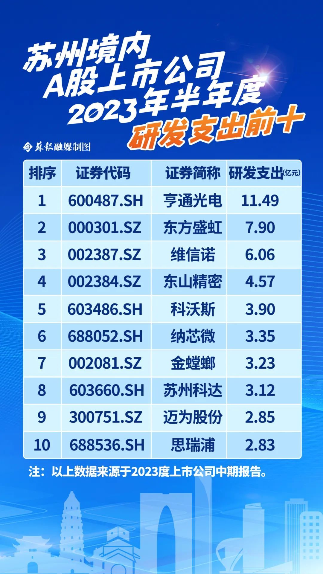 结合半年报看,上半年苏州213家上市公司研发投入合计高达144.54亿元,创历史同期新高。作为光通信龙头,亨通光电不断增加科研投入,上半年合计研发投入超过10亿元,为11.49亿元。东方盛虹、维信诺紧随其后,研发投入分别为7.90亿元和6.06亿元。共有30家苏州上市公司研发投入超过1亿元。