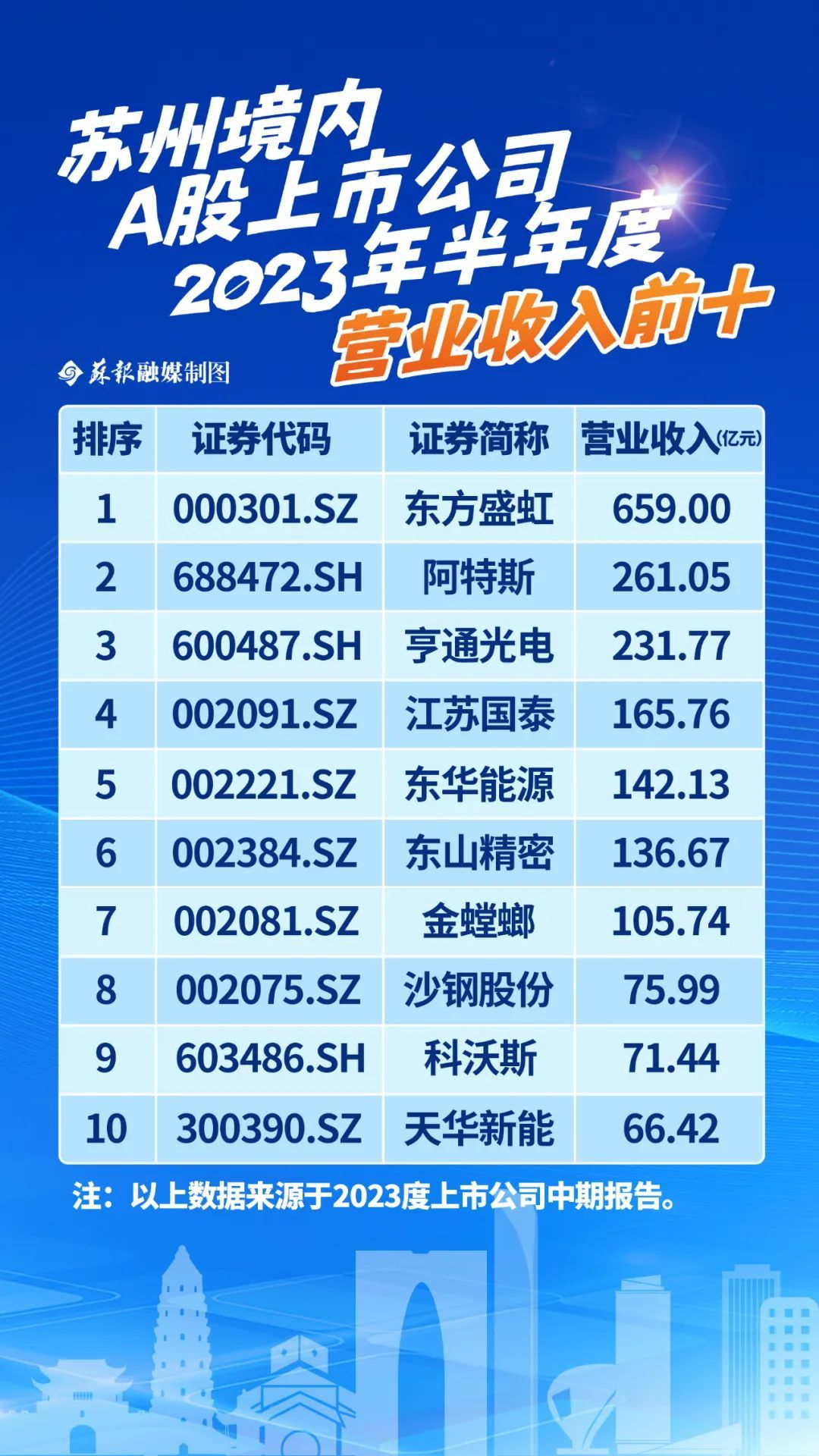 半年报数据显示,A股“苏州板块”今年上半年共实现营业收入超3900亿元,净利润超265亿元。其中有7家上市公司营收超过百亿元,32家净利润实现翻倍,过半公司净利润实现增长。“苏州板块”整体经营业绩稳中向好。其中,东方盛虹的营收遥遥领先。今年上半年,实现营收659亿元,同比增长117.91%,创出半年度营收规模历史新高,并一举超过了2022年公司全年的营业收入,实现了历史性的突破。