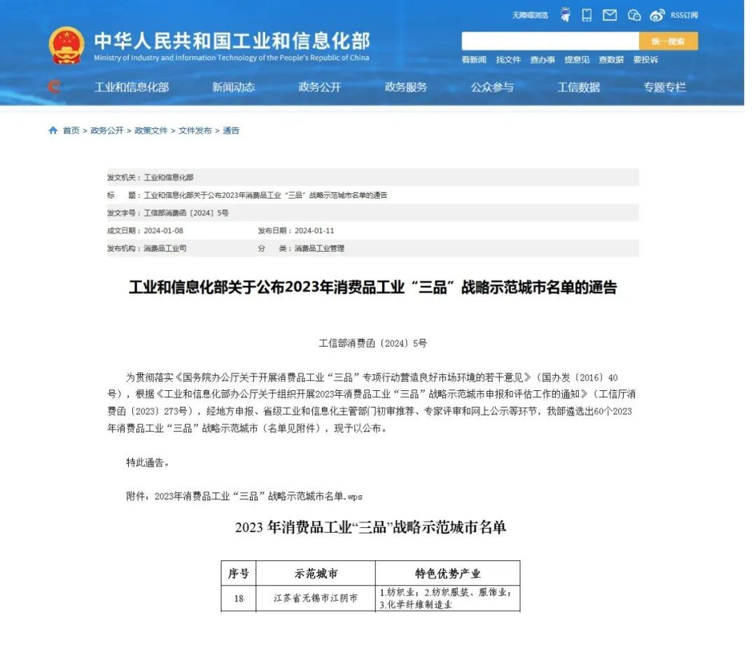 制造业是江阴的立市之本、强市之基,而消费品工业是江阴制造业的重要组成部分。近日,工业和信息化部公布了2023年消费品工业“三品”战略示范城市名单,江阴以“纺织业、纺织服装服饰业、化学纤维制造业”三个特色优势产业成功入选。