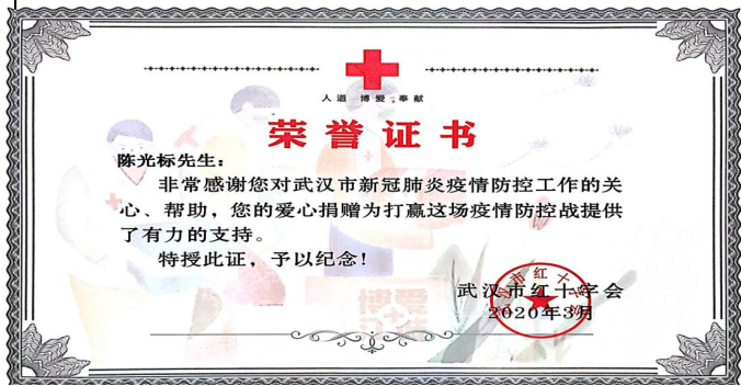 2020年,武汉发生新冠疫情后,陈光标赶赴武汉做志愿者,捐赠了300万只优质口罩、1000台消毒喷雾器和50吨消毒液及粮、油约150万吨,合计人民币5000万元。