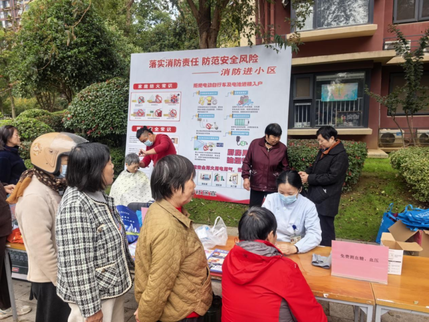 活动现场,随处可见社区网格员忙碌的身影。他们有的维持秩序,有的辅助卫生院医务人员进行血压测量及数据记录,有的向居民宣传消防等知识。