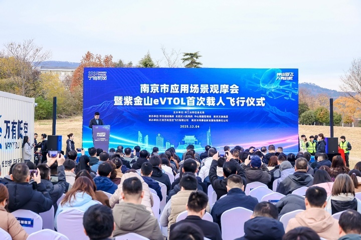 12月4日,2025年南京“宁创新品”系列活动收官之作——“宁创新品”南京市应用场景观摩会暨紫金山eVTOL首次载人飞行仪式,于钟山体育运动公园盛大启幕。本次活动以“钟山首飞·万有启航”为主题,由南京市工业和信息化局主办,市交通运输局、玄武区人民政府等单位协办,南京市场景创新发展有限责任公司与江苏万有低空飞行有限公司联合承办。这既是南京践行产业强市战略、推进全域场景创新的关键实践,也是文商旅融合、先进制造业与现代服务业“两业”融合发展的鲜活范例,为城市创新生态与产业融合升级注入强劲动力。