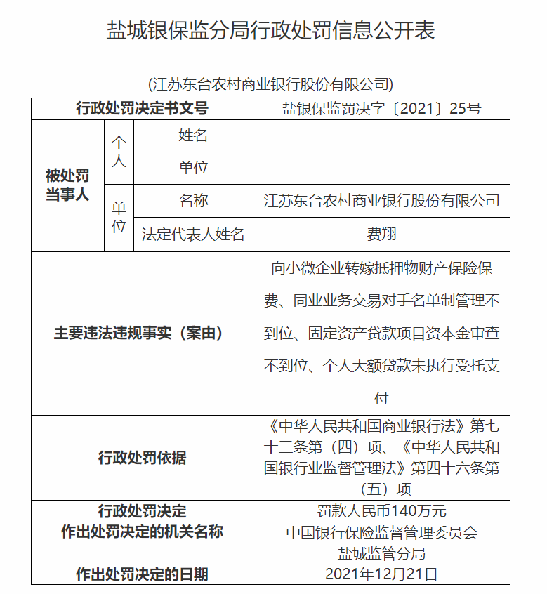 2021年12月27日,银保监会网站披露了盐城银保监分局行政处罚信息公开表(盐银保监罚决字〔2021〕25号)。据信息公开表显示,江苏东台农商行存在向小微企业转嫁抵押物财产保险保费、同业业务交易对手名单制管理不到位、固定资产贷款项目资本金审查不到位、个人大额贷款未执行受托支付的主要违法违规事实。盐城监管分局依据《中华人民共和国商业银行法》第七十三条第(四)项、《中华人民共和国银行业监督管理法》第四十六条第(五)项,对江苏东台农商行处以罚款人民币140万元。同时,该行的4位员工因对受处罚项负直接责任也均被处以警告,并罚款人民币5万元。