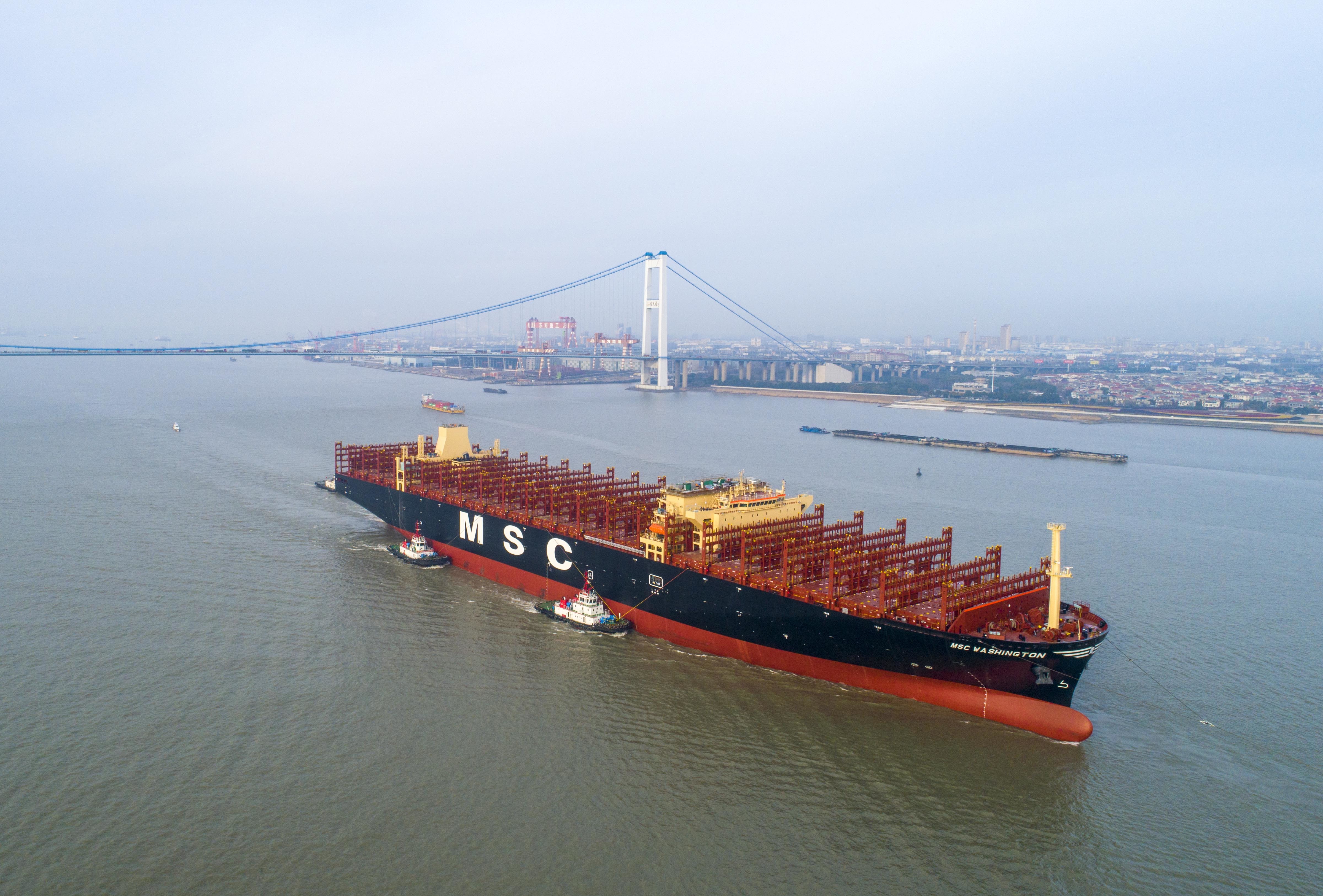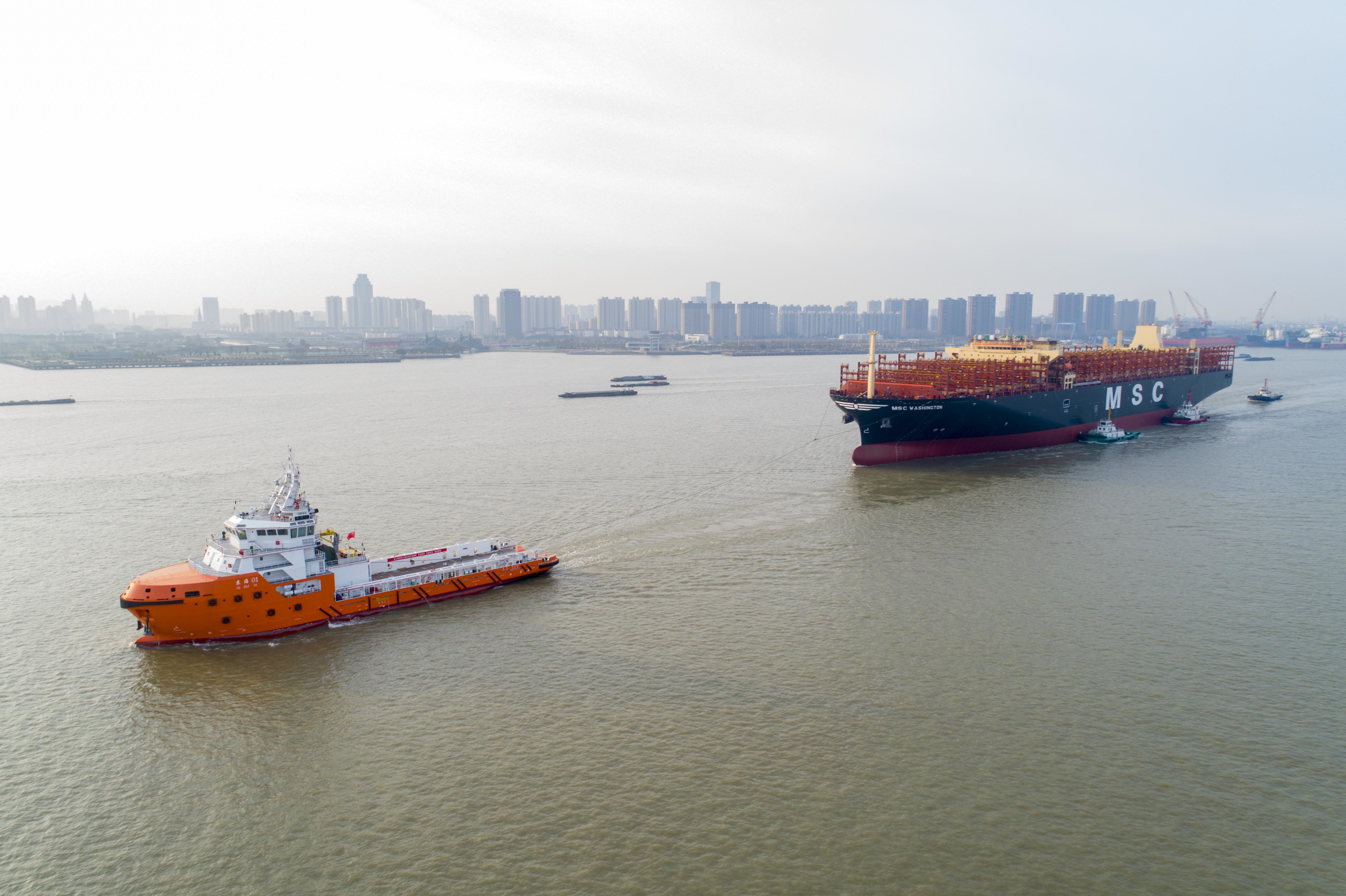 据了解,“鑫福90”轮为江苏扬子江船业集团公司建造的首艘14000TEU集装箱船,也是泰州建造尺度最大的集装箱船,船长335米、船宽51米、型深30米,最大吃水7米,龙骨以上最大高度73米,超过江阴大桥净空高度的限制,需割除5层上层建筑和部分烟囱,以拖带的形式从江苏泰兴扬子鑫福码头移泊至太仓扬子三井码头,完成复装后,再开展试航试验。本次拖带航程远、耗时长,途径水域船舶密度大、通航环境复杂,这也是长江航运有史以来拖带船舶长度最大、难度最大的一次拖带作业,拖带船舶长度和难度都刷新了长江通航史记录。为完成本次拖带作业,江苏海事部门投入22艘海巡艇、4艘警戒维护艇,并在沿途设置10艘应急拖轮待命点,全力保障拖带作业船舶编队航行和靠离泊安全。