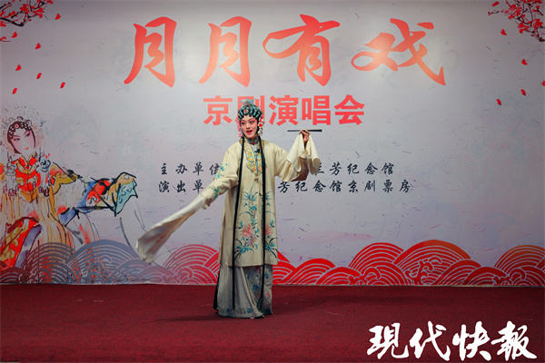 与桃园相隔不远处,是梅兰芳纪念馆所在地梅园。记者跟随采风团走进梅园,一尊梅兰芳先生的汉白玉雕像坐落在院中,据景区工作人员介绍,这是人民英雄纪念碑创作者刘开渠的封刀之作,是“当世最完美的梅兰芳雕像”。当天,景区举办了“月月有戏”京剧系列活动,不少京剧迷们在此欣赏京腔梅韵。