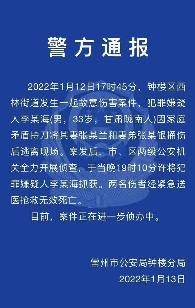 2022年1月12日17时45分,常州市钟楼区西林街道发生一起故意伤害案件,犯罪嫌疑人李某海因家庭矛盾持刀将其妻张某兰和妻弟张某银捅伤后逃离现场。案发后,市、区两级公安机关全力开展侦查,于当晚19时10分许将犯罪嫌疑人李某海抓获。两名伤者经紧急送医抢救无效死亡。目前,案件正在进一步侦办中。