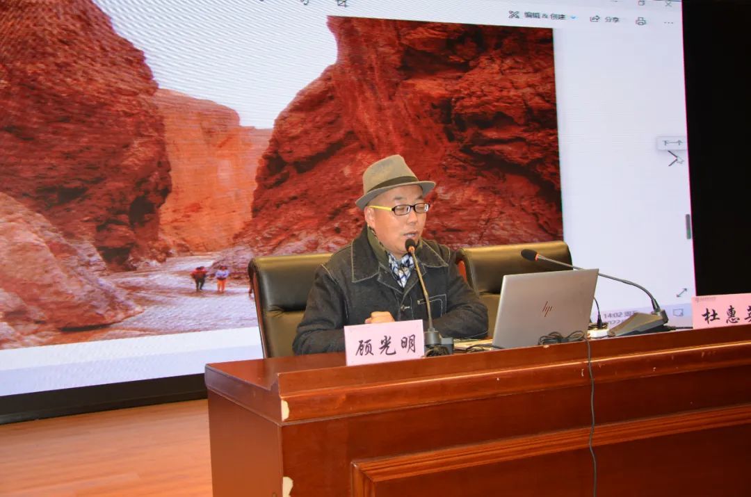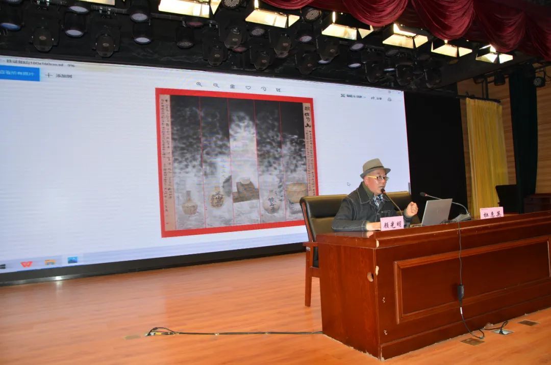 讲座现场,顾光明教授结合援疆经历,向同学们介绍了南疆克州雄山圣水大美风光,以及祖国统一的多民族历史文化;还讲述援疆期间向身边英雄模范学习,用艺术讲好南疆故事:一是赴塔县“时代楷模”拉齐尼·巴依卡家中探望和慰问,为其妻子,儿子及巴依卡老人速写肖像,以艺术方式收集素材,为创作和宣传英雄做准备。二是俩次赴乌恰县吉根乡,拜访“人民楷模”布茹玛汗·毛勒朵,为其画肖像,敬赠书法《冬古拉玛妈妈》,以艺术方式表达敬仰之情。三是赴乌恰县人民医院,拜望“白衣圣人”吴登云医生,先后为其速写多幅,敬赠书法作品《大爱无疆》,对一辈子驻守边疆的长者肃然起敬。四是为帮游客解决困难拒收报酬,亮出党徽的牧民阿布都加帕尔·猛得速写肖像等;然后向同学们展示红色主题系列作品《殷雪梅》、《铁证如山》、《海军诞生地纪念馆》、《雨花清明颂》等创作和作品背后感人故事。通过红色艺术作品欣赏与创作阐述,为同学们上了一堂鲜活生动的主题性艺术课程。在以情感人,以美育人的氛围中,同学们纷纷表示,一定向英雄看齐,认真学好文化,刻苦掌握专业,将来报效祖国。