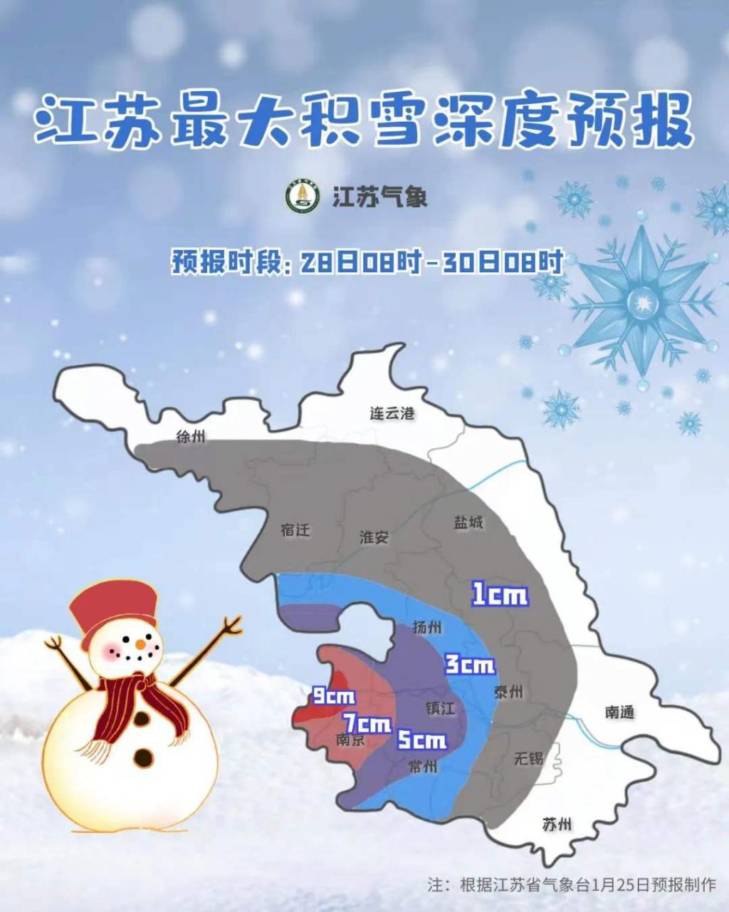 受冷暖气流共同影响,26日江苏省以降雨为主,27-29日降水相态将转为雨夹雪或雪,27日夜间至28日淮河以南中西部地区,包括南京、镇江、扬州等地,将有大到暴雪,局部大暴雪。
