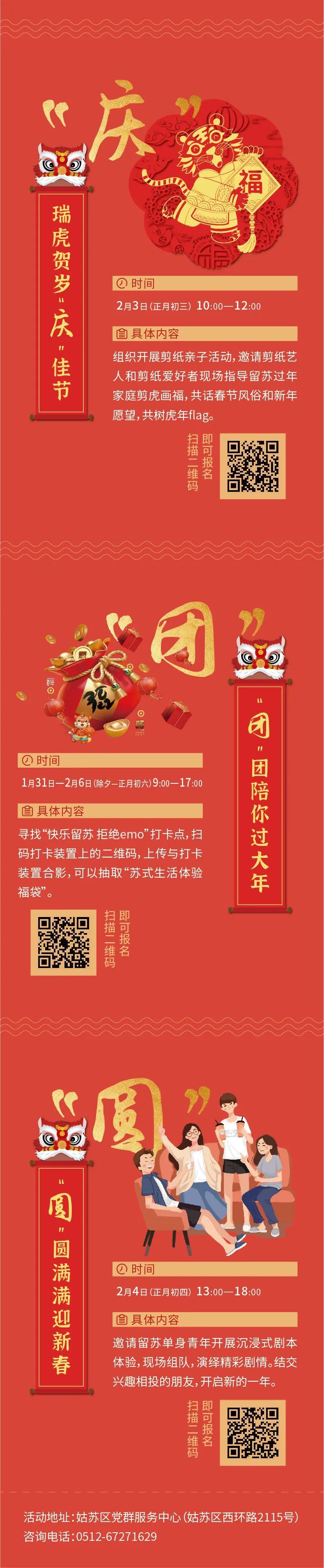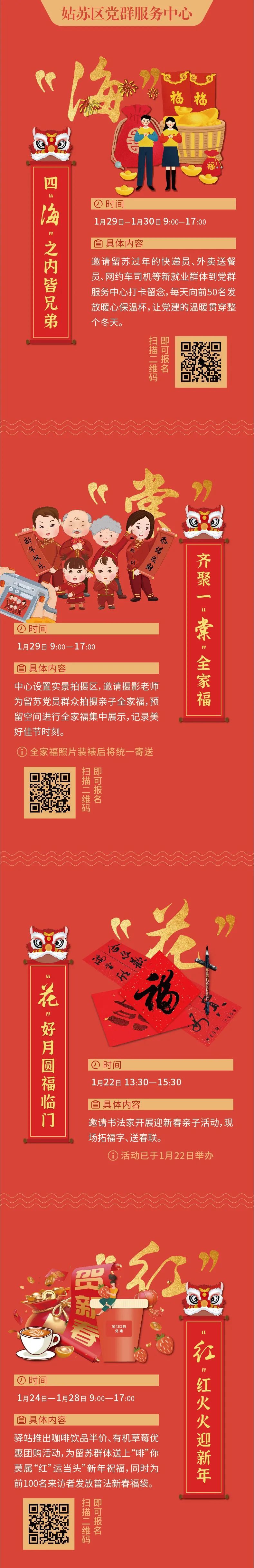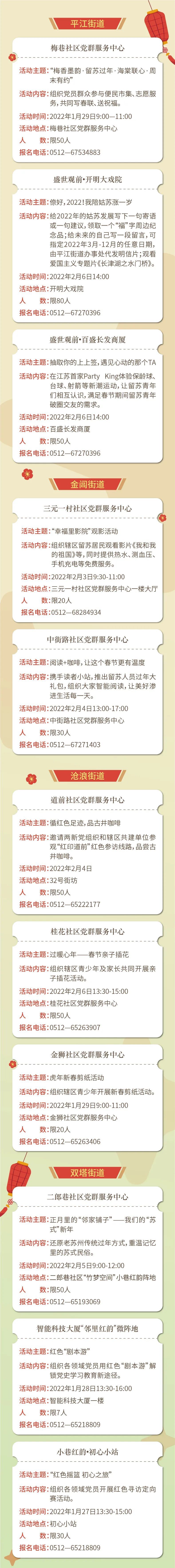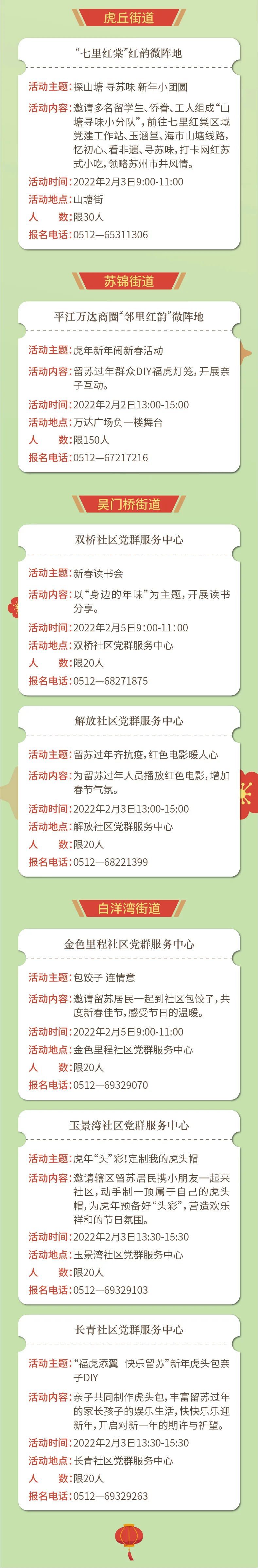 为深入推进“千朵海棠·花开姑苏”党建服务体系建设,充分发挥各级党群服务中心的服务功能,保护区党工委、姑苏区委组织部汇聚团区委、区文联等资源,联动各街道社区,在春节前及春节期间举办“新春有约·海棠联心——我在姑苏过大年”活动,让留苏过年的党员群众们感受到虎年春节的洋溢气氛和“苏式”春节的浓郁年味儿。