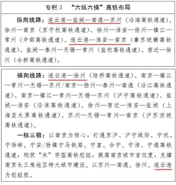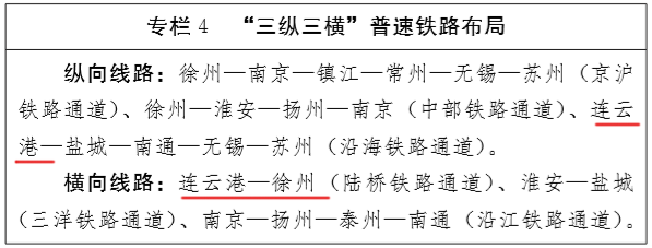 普速铁路方面,融入“三纵三横”布局,全面建成连云港—盐城—南通—无锡—苏州的沿海铁路通道和连云港—徐州的陆桥铁路通道。