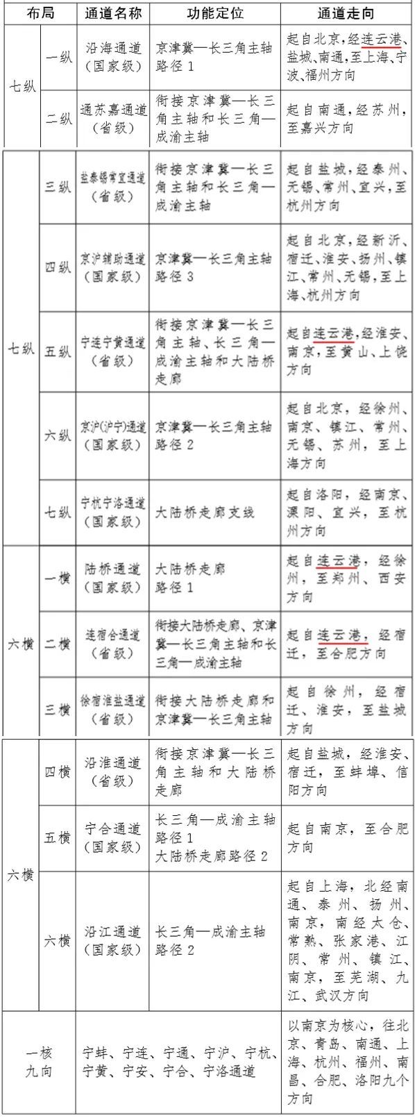 为此,我省将强化国家综合立体交通网主骨架中“京津冀—长三角主轴、长三角—成渝主轴、大陆桥走廊”在省域内的连通,加密省内运输通道,形成以南京为核心的“七纵六横,一核九向”综合运输通道布局。