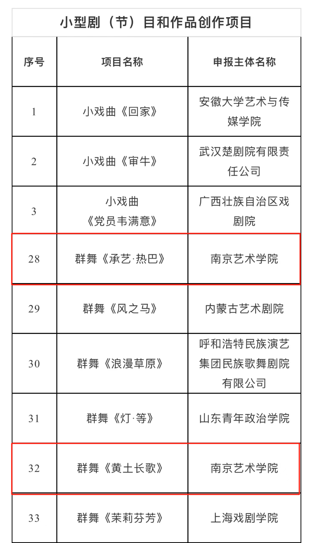近日,国家艺术基金管理中心公示了2022年度国家艺术基金(一般项目)资助项目名单,南艺舞蹈学院原创群舞作品《承艺·热巴》《黄土长歌》入选“小型剧(节)目和作品创作”(目前正在公示中)。据悉,此次国家艺术基金资助项目——舞台艺术创作项目共有申报3481项,其中,小型剧(节)目和作品创作项目有2335项,而最后仅有93项作品入选小型剧(节)目和作品创作项目(包含舞蹈类作品23项)。南艺舞院两支优秀作品的入选,从一定意义上而言,是对南京艺术学院多年来艺术创作、人才培养等方面努力积淀的认可。