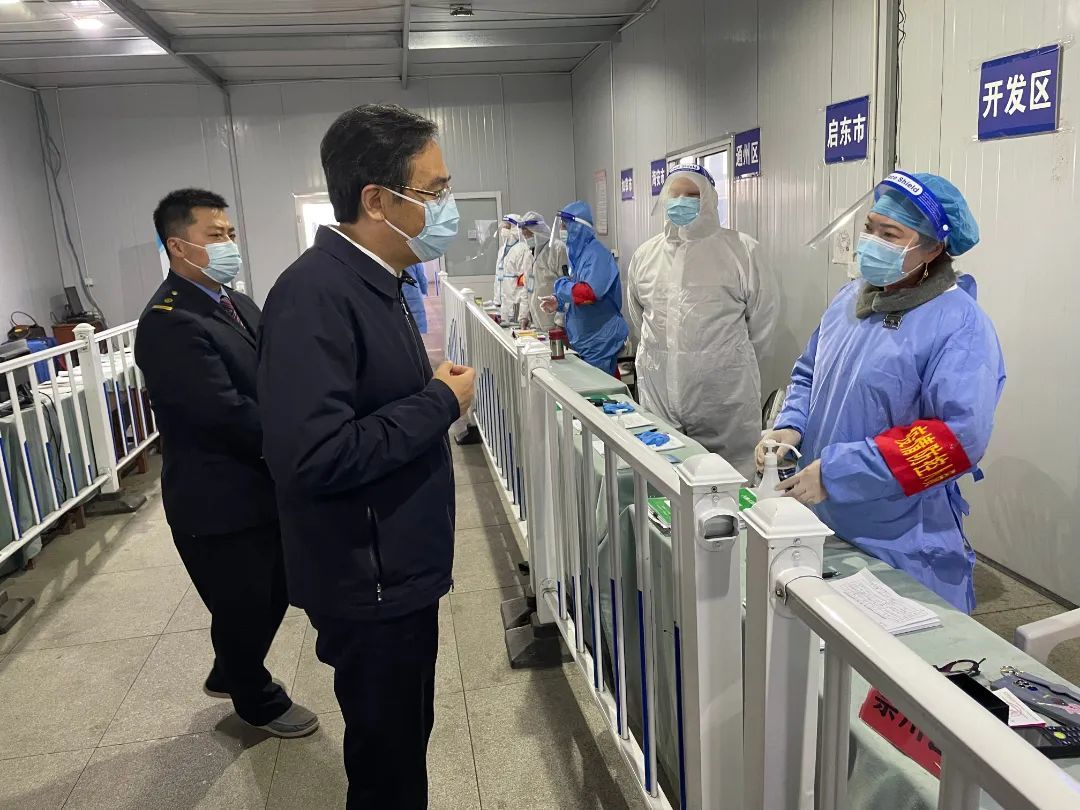 在沈海高速南通开发区出口,驾乘人员在工作人员引导下有序进行登记查验。车辆通行是否有序?有没有排队过长的现象?……王晖十分关心卡口的通行情况,强调要进一步细化交通组织方案,合理设置分流通道,优化查验流程,既要做到严把关口、查验到位,又要确保秩序井然、行车安全。在专用窗口前,工作人员正指导重点地区人员扫码登记,进行核酸检测。王晖认真询问相关情况,要求用好核酸检测与抗原筛查相结合等有效措施,完善多渠道监测预警机制,着力提高“早发现”能力,第一时间把潜在风险排查出来、处置到位。