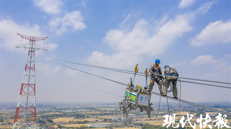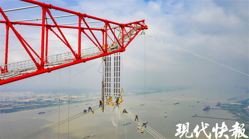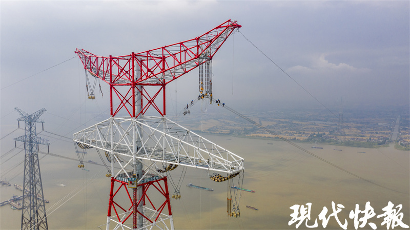 6月2日,江苏385米的世界最高输电铁塔开展跨越长江的导线施放工作。现代快报记者了解到,作为国家电网北电南送的重点工程,线路贯通后,可以将长江北岸的新能源源源不断送往江南,全面提升长三角地区的绿色可持续发展能力。