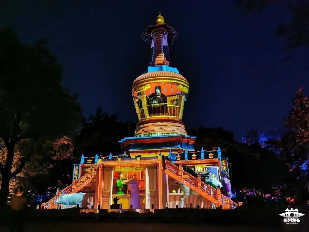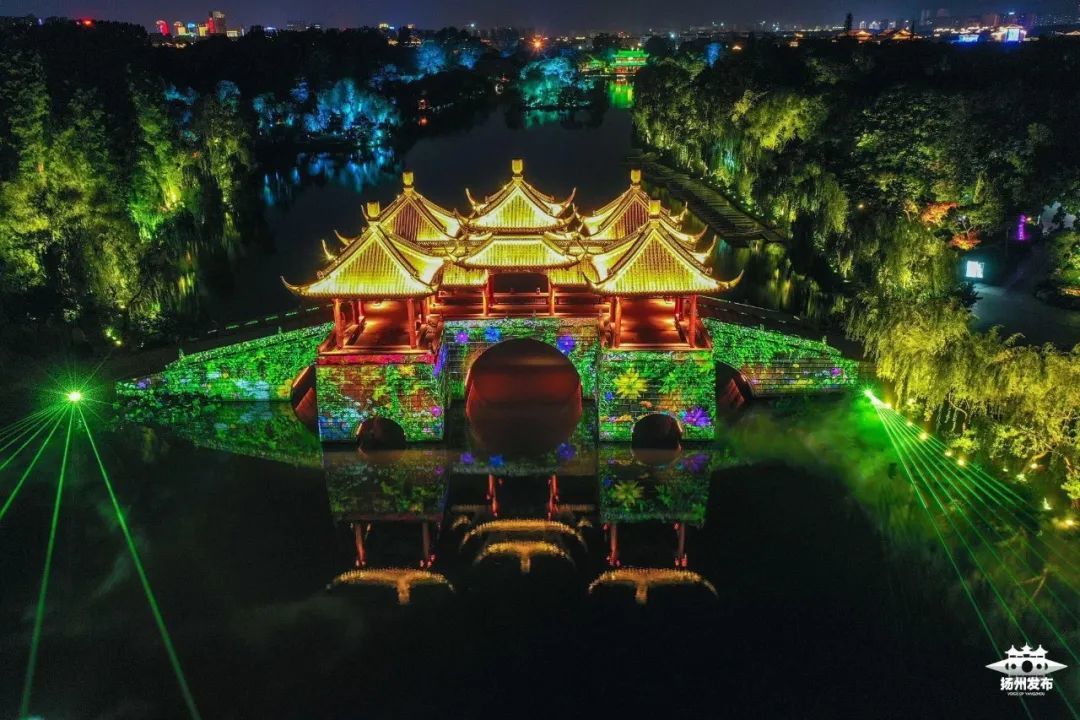 璀璨灯火下,徜徉湖畔亭台,聆听蛙声蝉鸣,“光影绘唐诗”的盛景,将“扬州的夏日”装扮得如梦如幻。