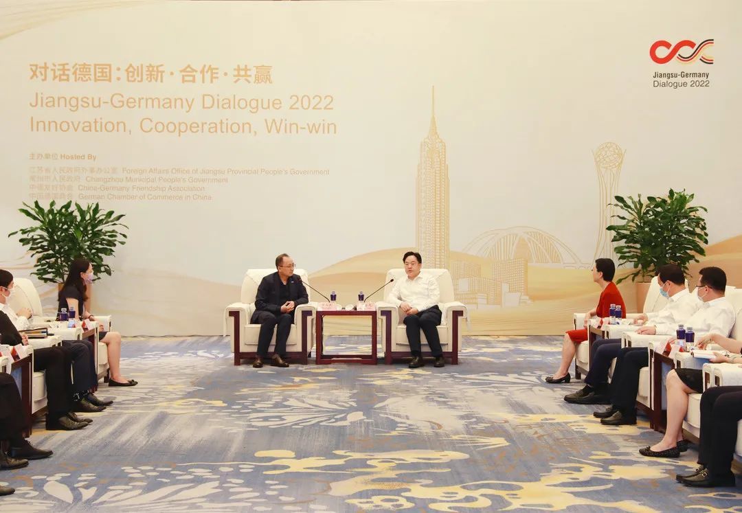7月7日,由江苏省人民政府外事办公室、常州市人民政府、中德友好协会、中国德国商会联合主办的2022“对话德国”活动在常州市举行。常州市委书记陈金虎会见了德国海外商会联盟大中华区副总裁徐晶波等来常参加活动的重要嘉宾。