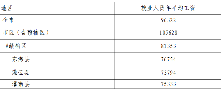 根据年度统计调查结果,2021年连云港市城镇非私营单位就业人员年平均工资96322元;其中,全市在岗职工年平均工资为100211元,市区(含赣榆区)在岗职工年平均工资为110813元。2021年全市城镇私营单位就业人员年平均工资54849元。