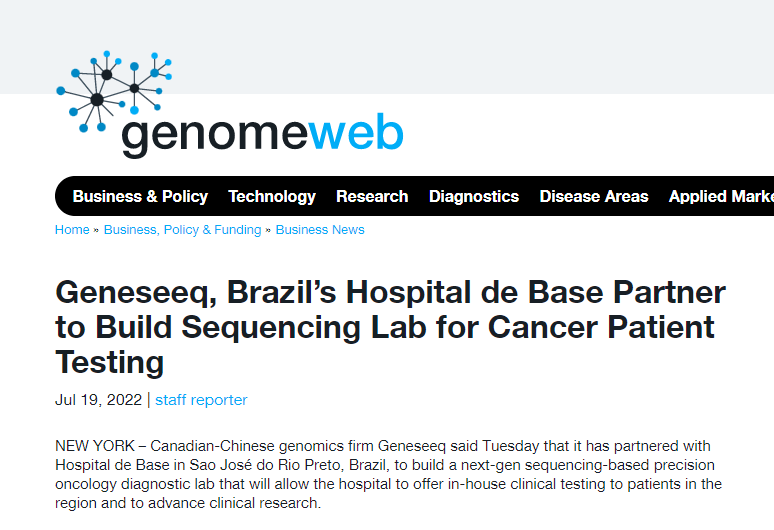 近日,美国知名基因测序领域媒体GenomeWeb报道,江北新区南京生物医药谷园区企业世和基因与巴西Hospital de Base医院达成战略合作,共建院内NGS实验室,推进肿瘤临床研究。