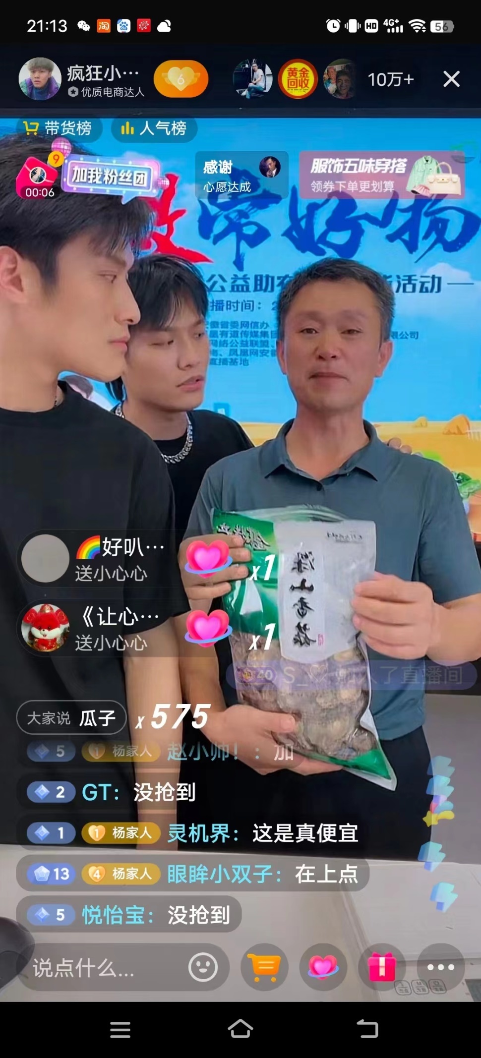 在三只羊基地的直播间,短视频头部达人疯狂小杨哥在直播间详细介绍了甄选的特色农产品。六安瓜片、淮南牛肉汤、香薯干、闷蒜、黄山毛峰……一场别开生面的特色农产品直播吸引了累计1315.56万人次观看,最高在线人数达到近100万。广大网友也积极响应助农直播,据凤凰网安徽统计,在直播的90分钟时间里售出甄选农产品超20万单。