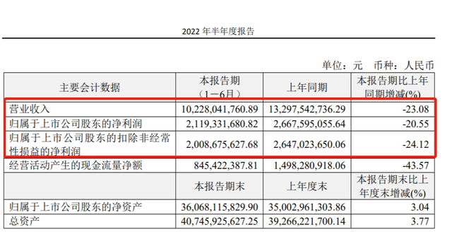 报告期内,恒瑞医药实现营业收入102.28亿元,同比下降23.08%;归属于母公司所有者的净利润21.19亿元,同比下降20.55%;归属于公司股东的扣除非经常性损益的净利润20.09亿元,同比下降24.12%。