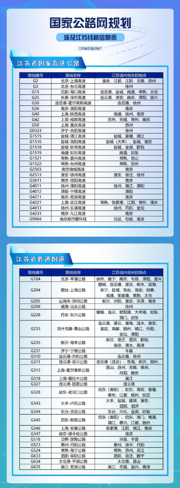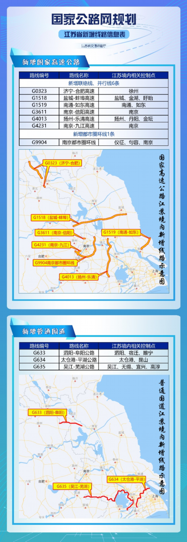 与上一轮规划《国家公路网规划(2013年—2030年)》相比,本轮《规划》江苏境内普通国道由22条增至25条(新增里程约490公里),新增普通国道3条,分别是:
