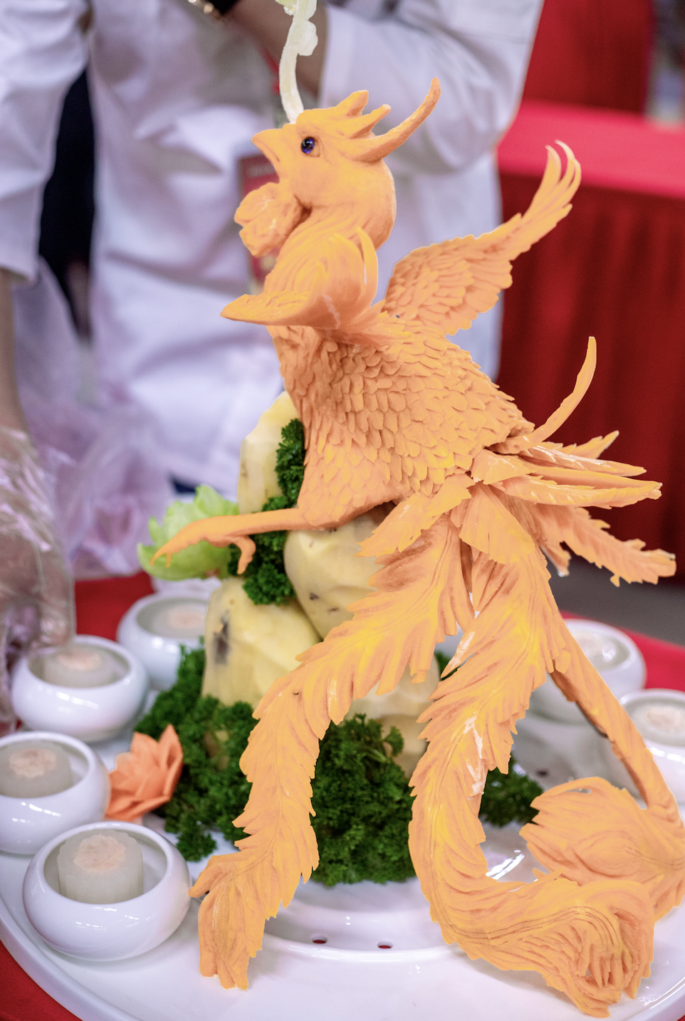 开幕式结束后,接下来就是紧锣密鼓的评选环节,由资深中国烹饪大师戴尔发、王绕祥等四人组成了评审组,为在场的92名选手依次打分。