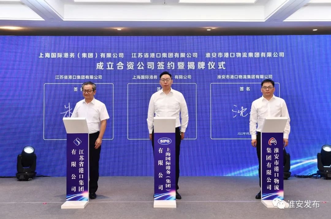 9月2日上午,淮安港与上港、省港成立合资公司签约暨揭牌仪式举行,市委书记陈之常,上海国际港务(集团)股份有限公司总裁严俊,江苏省港口集团有限公司总经理关永健,副市长张笑见证合资公司签约并共同为合资公司揭牌,标志着上港(淮安)国际集装箱码头有限公司正式成立,三方战略合作迈进新阶段。