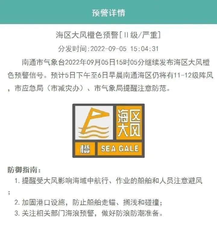 南通市气象台2022年09月05日15时05分继续发布海区大风橙色预警信号。预计5日下午至6日早晨南通海区仍将有11-12级阵风,市应急局(市减灾办)、市气象局提醒注意防范。