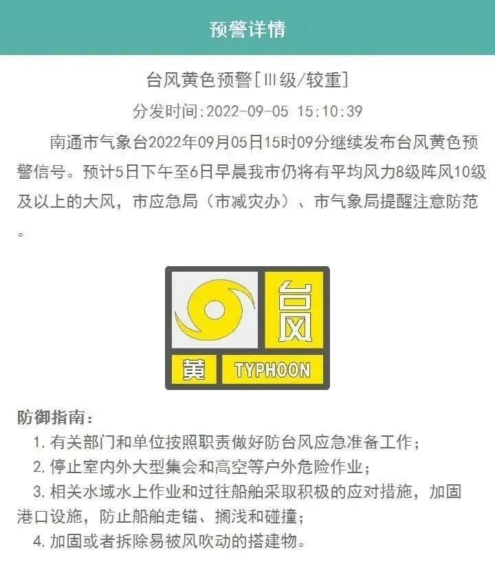 南通市气象台2022年09月05日15时09分继续发布台风黄色预警信号。预计5日下午至6日早晨我市仍将有平均风力8级阵风10级及以上的大风,市应急局(市减灾办)、市气象局提醒注意防范。
