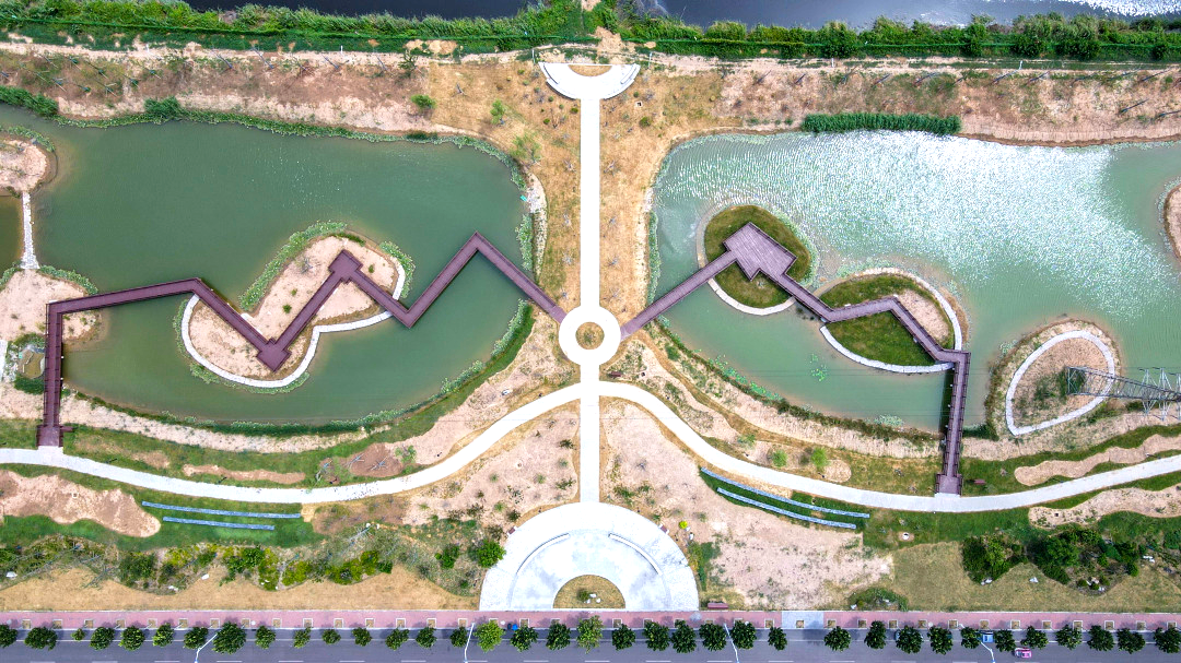 这是建在采煤沉陷区荒草湖泊上的景观公园——水中鱼儿成群结队、岸上草木郁郁葱葱、脚下步道弯弯延伸……不仅是一道亮丽风景线,还是一条尾水净化线。