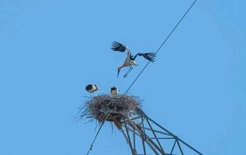 经过31-34天的卵化期,可以发现雏鸟每天由雌雄亲鸟共同喂养,雏鸟长到60-63日龄后,便可以随亲鸟飞离巢区觅食了。但很可惜,在后来的拍摄中发现只有三只成功出巢。六个多月里志愿者们见证了小白鹳成长过程中的点点滴滴,同时也为周边居民普及了关于野生动物保护方面的知识,让大家充分认识到东方白鹳在连云港成功繁殖的生态意义和巨大价值。