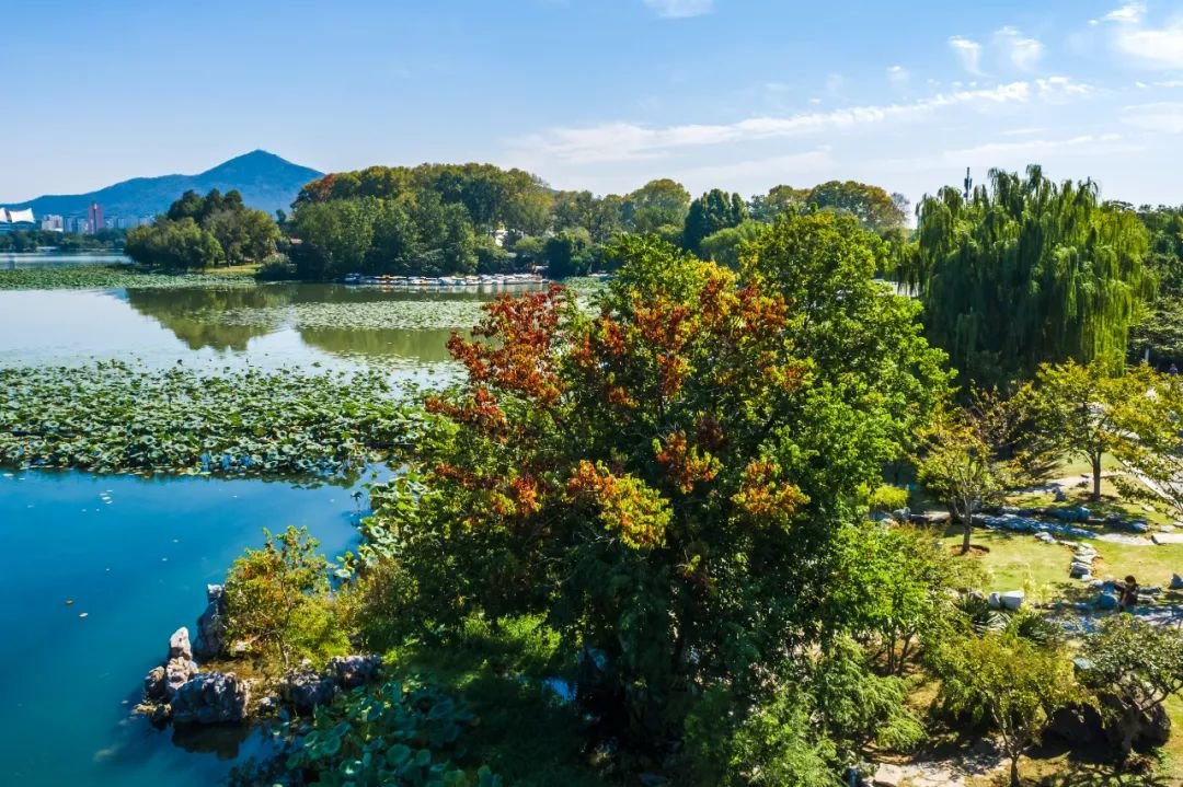台菱堤两侧的榉树由绿泛黄而红,犹如打翻了调色盘,与远处层林尽染的紫金山相映成趣,这里也是泛舟赏秋的最佳观赏点哦!