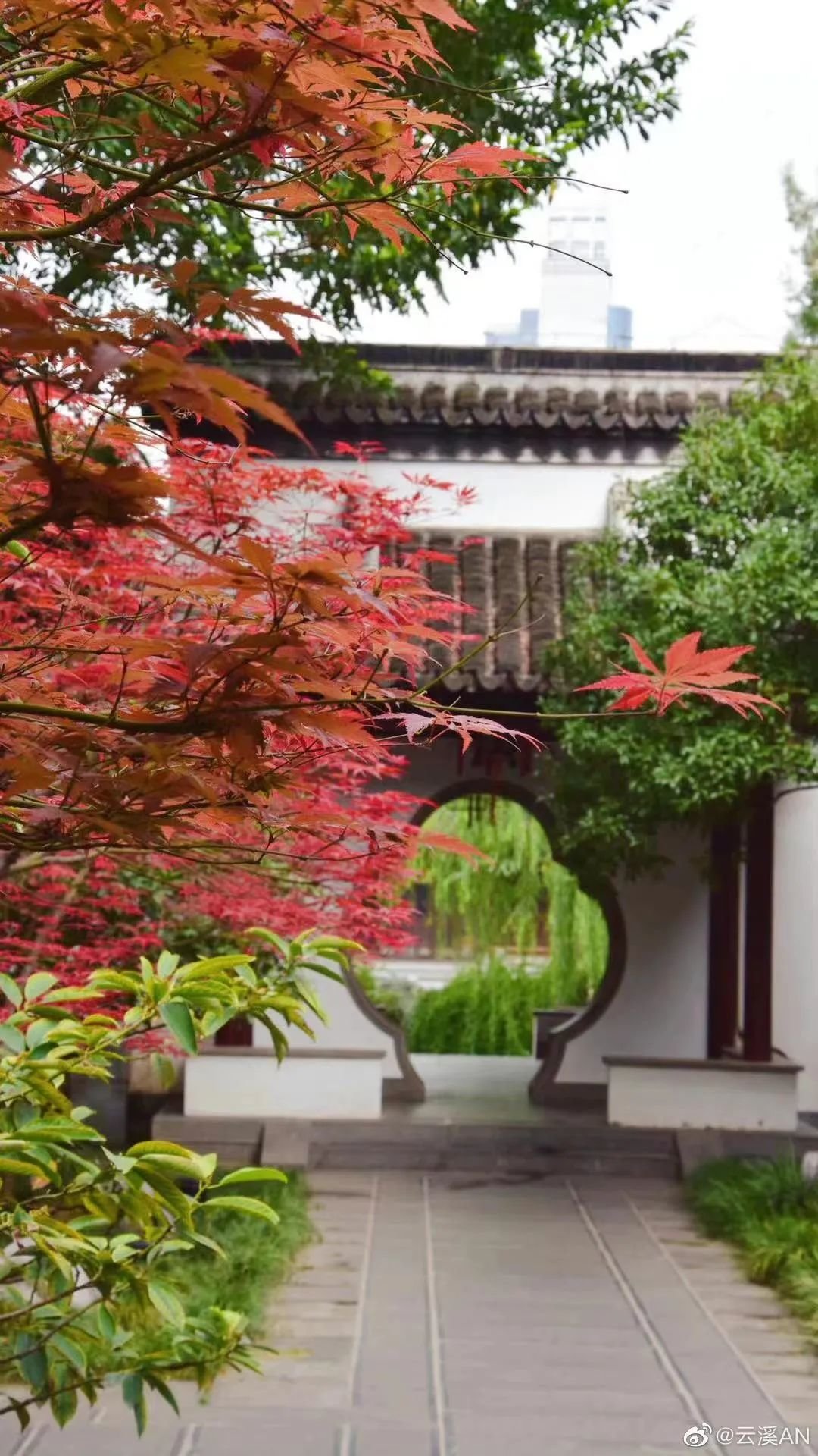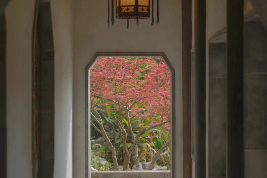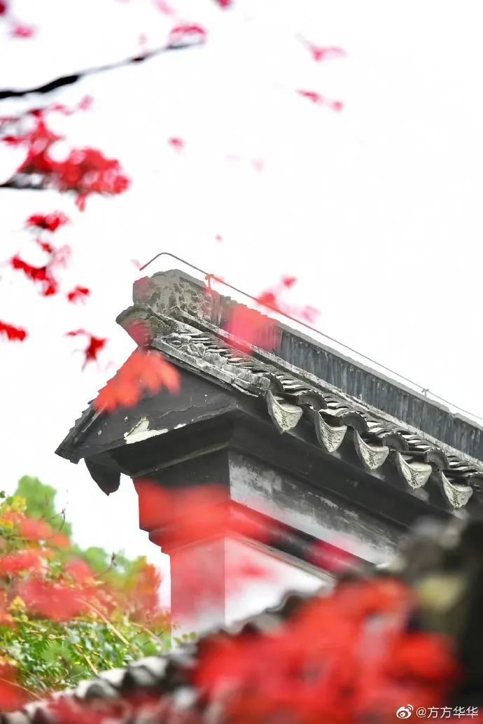 白墙黑瓦之间,几处红韵与四周的绿交相辉映,给古朴静谧的园林带来满园生气。