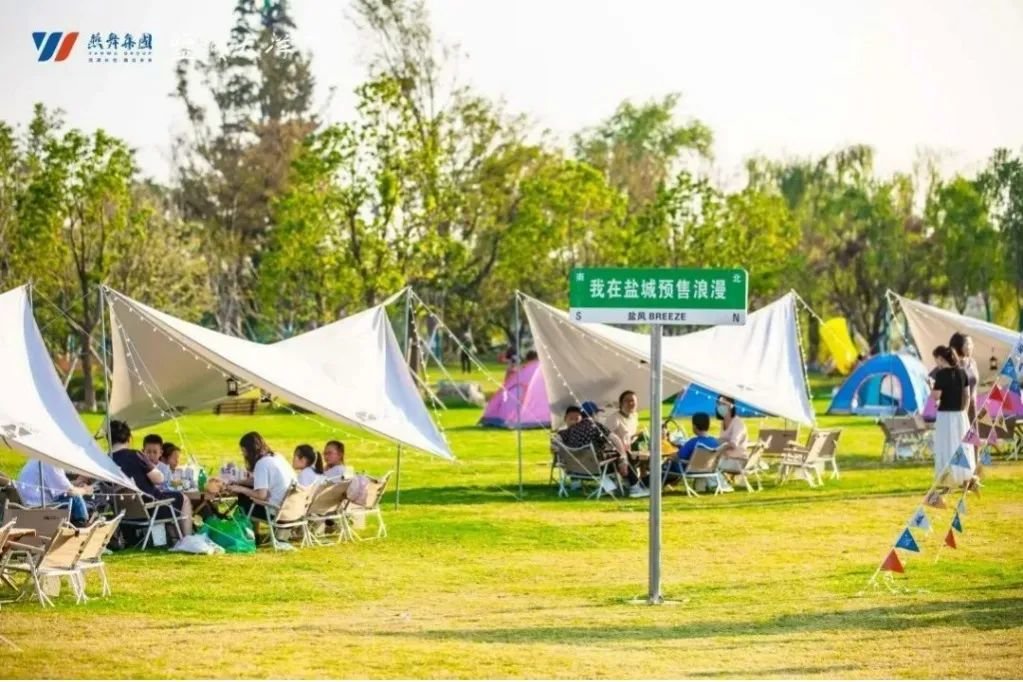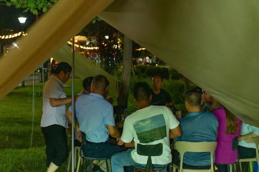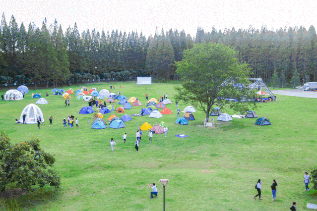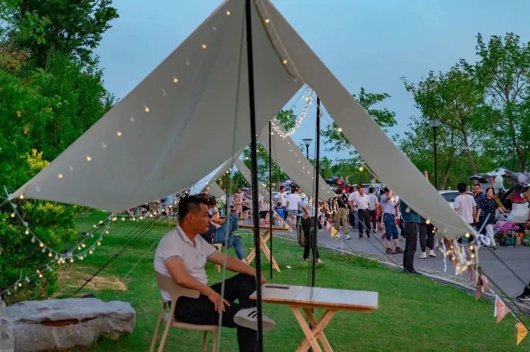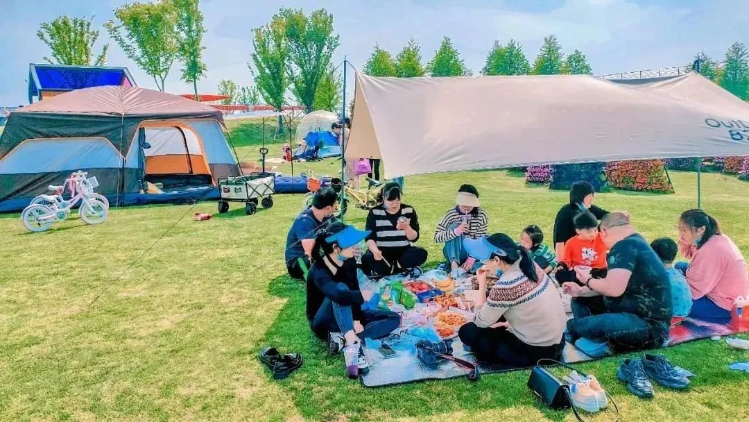 草地上搭建着各式各样的帐篷。孩子在四周嬉闹,空中风筝飘飘,帐篷就像草坪中盛开的朵朵鲜花。三五好友齐坐,聊生活话家常......