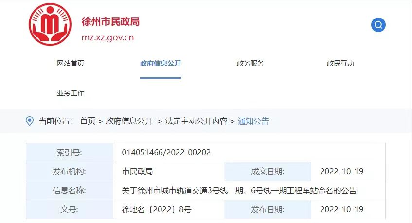近日,徐州市民政局官网发布《关于徐州市城市轨道交通3号线二期、6号线一期工程车站命名的公告》徐州地铁3号线二期、6号线一期站点命名现已确定,公告具体内容如下: