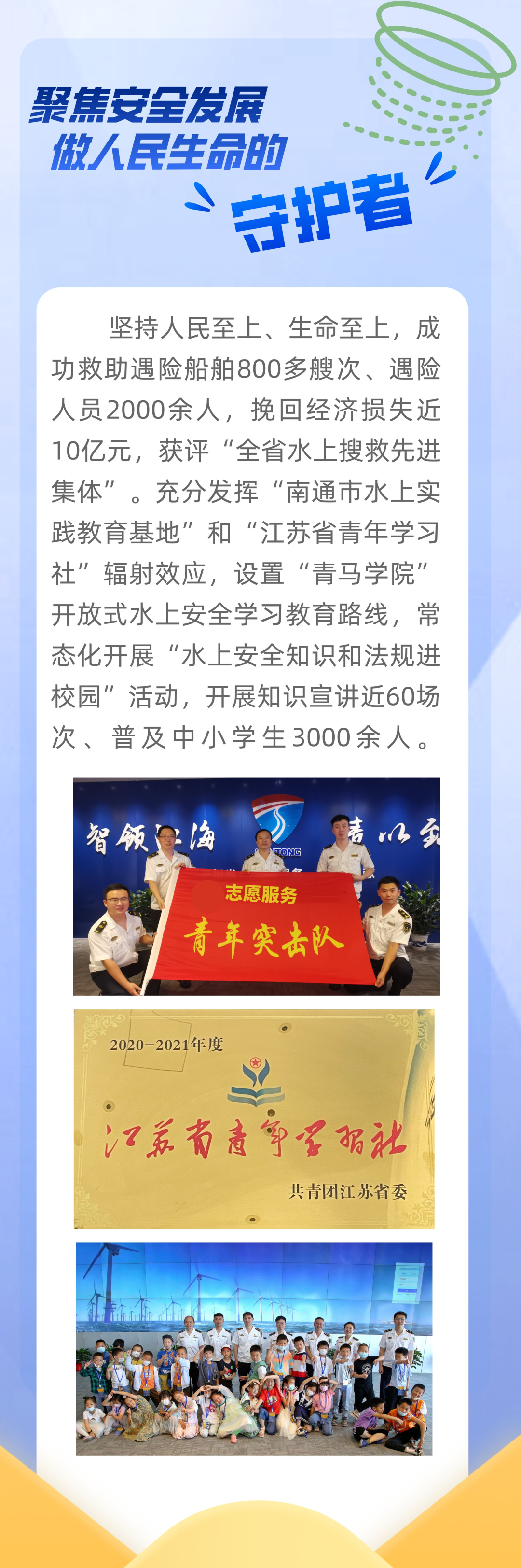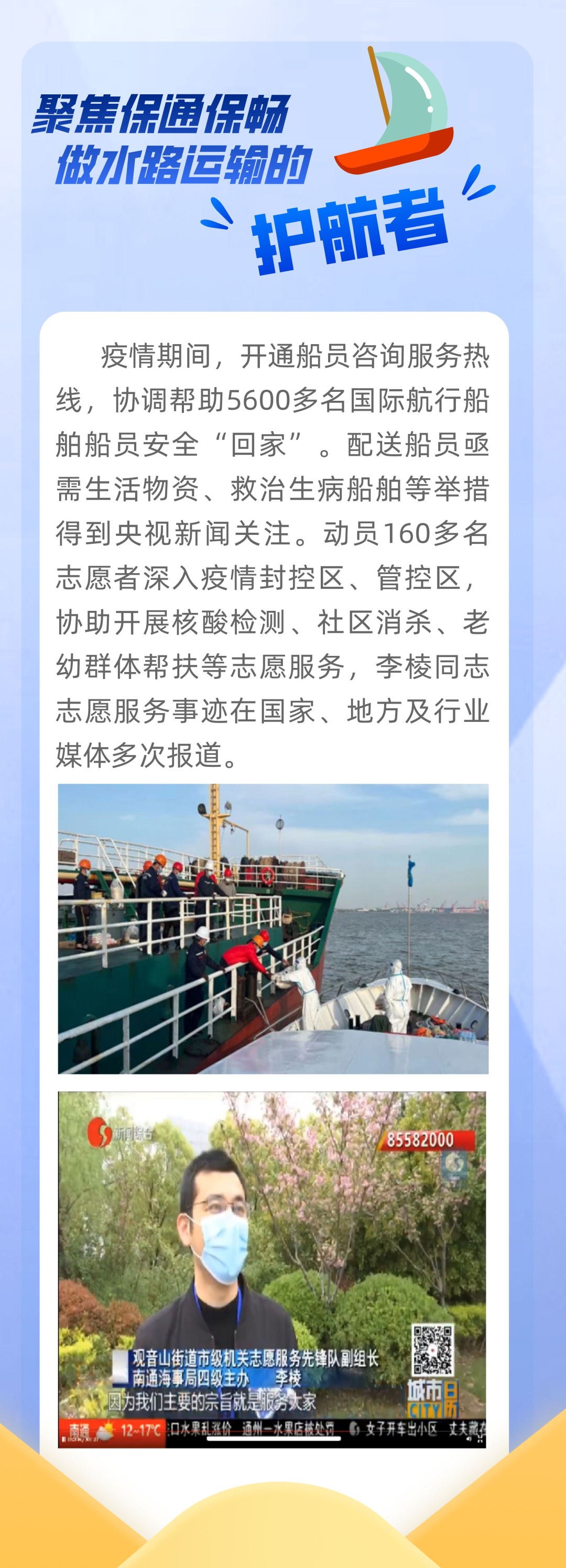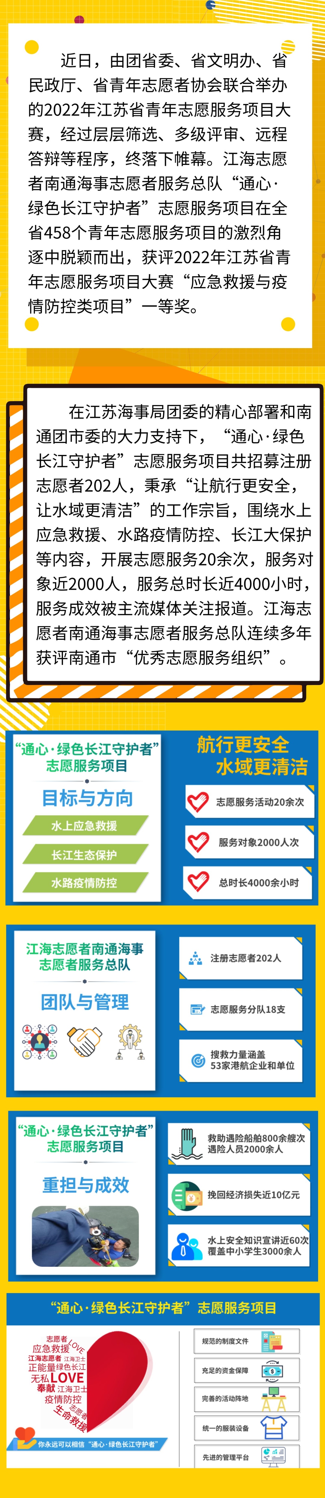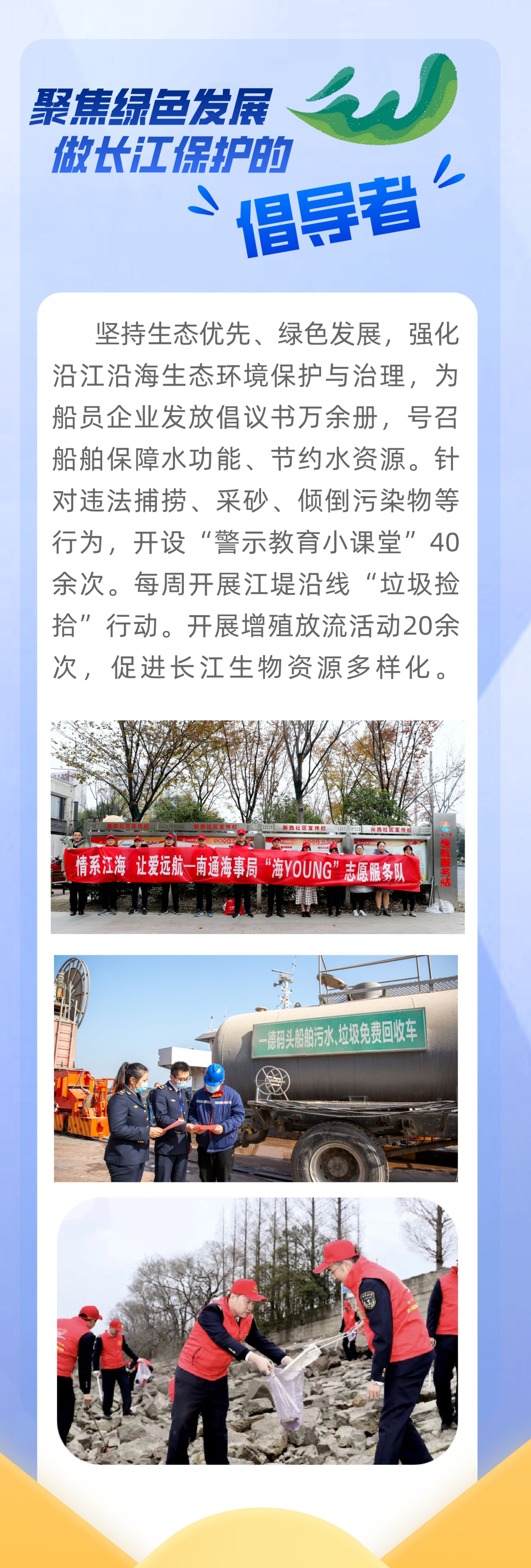 江海通城志愿蓝,齐心协力护长江,这正是“通心·绿色长江守护者”志愿服务项目矢志追求的愿景。南通海事局志愿者们将坚定不移听党话、跟党走,怀抱梦想又脚踏实地,敢想敢为又善作善成,让青春在志愿服务的火热实践中绽放绚丽之花。