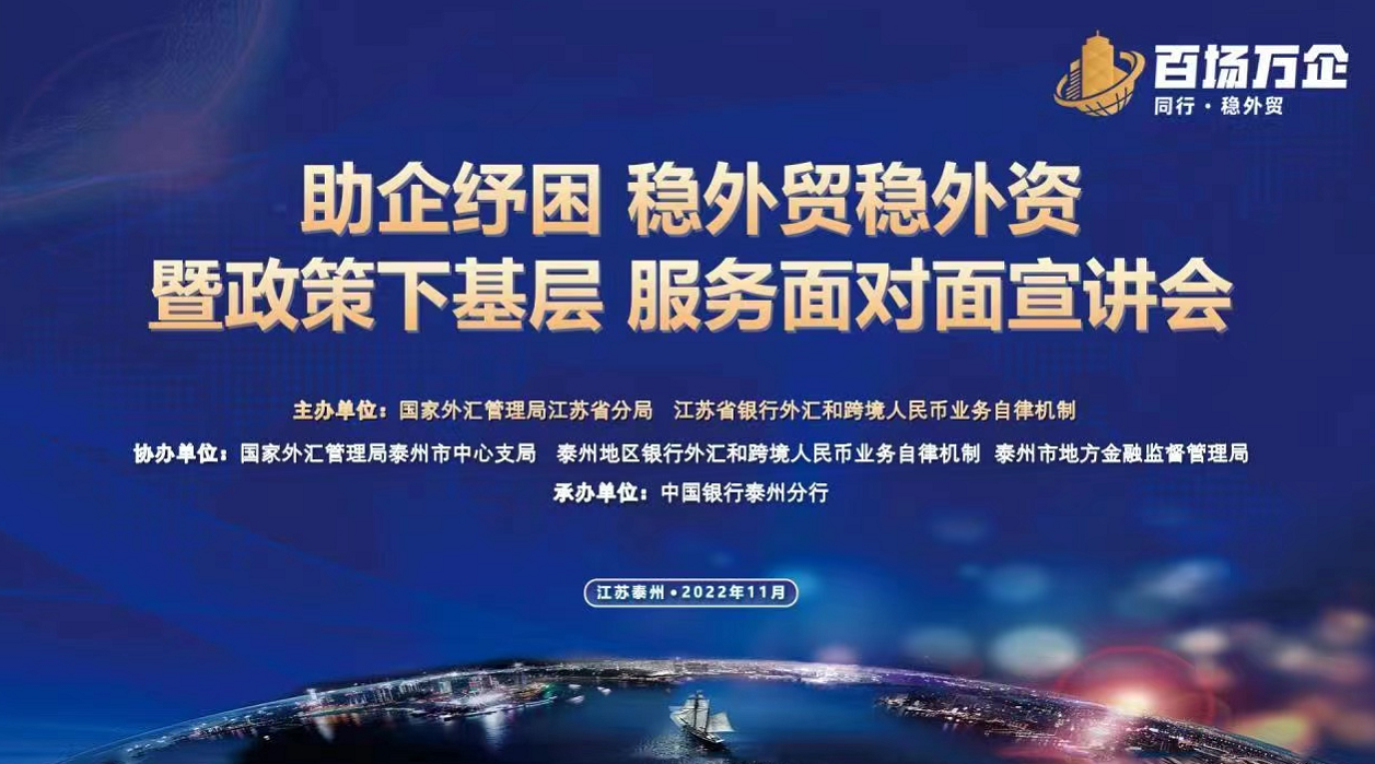本次泰州场宣讲活动是江苏中行“百场万企”系列活动的第十一场。今年以来,江苏中行充分发挥自律机制头雁作用,在江苏省外汇局的指导下,结合中国银行总行支持贸易高质量发展“百场万企”系列活动,通过线下+线上方式,在全省各地市进行外贸相关政策、金融产品运用等内容的宣讲,以实际行动支持外贸企业保订单、拓客户、促增长。此前,江苏中行已开展了十场“助企纾困,稳外贸稳外资”公益宣讲活动,线上线下共为逾5000家外向型企业提供了培训,其中多数为中小微企业。