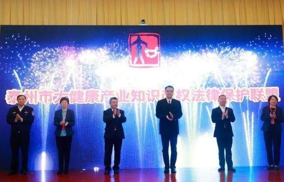 在“泰州市大健康产业知识产权法律保护联盟”成立仪式上,孙辙院长与市检察院检察长丁海涛,市委宣传部副部长、市新闻出版局(版权局)局长周焕祥,市司法局局长马雅斐,市公安局常务副局长徐军,市市场监管局(知识产权局)副局长李萍一道按亮启动屏。