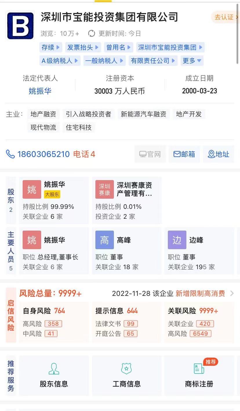 启信宝显示,目前深圳市宝能投资集团有限公司(即宝能集团)涉及的风险信息总量已经超过了9999条,被多个地方法院列为执行人。