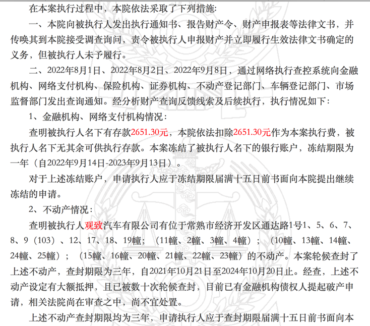 记者查阅中国裁判文书网时发现,今年11月27日发布的一份名为《江苏省常熟市人民法院执行裁定书》显示,常熟市人民法院通过网络执行查控系统向金融机构、网络支付机构、保险机构、证券机构、不动产登记部门、车辆登记部门、市场监督部门发出查询通知,经分析财产查询反馈发现,观致汽车名下存款只有2651.30元。