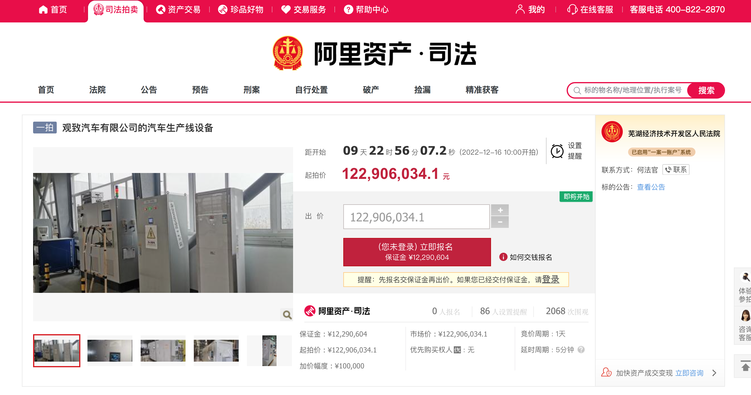 近日,阿里司法拍卖官网信息显示,安徽芜湖经济技术开发区人民法院发布了一则拍卖公告,标的为观致汽车有限公司(以下简称观致汽车)的汽车生产线设备,起拍价约为1.23亿元,起拍时间为12月16日上午10时。