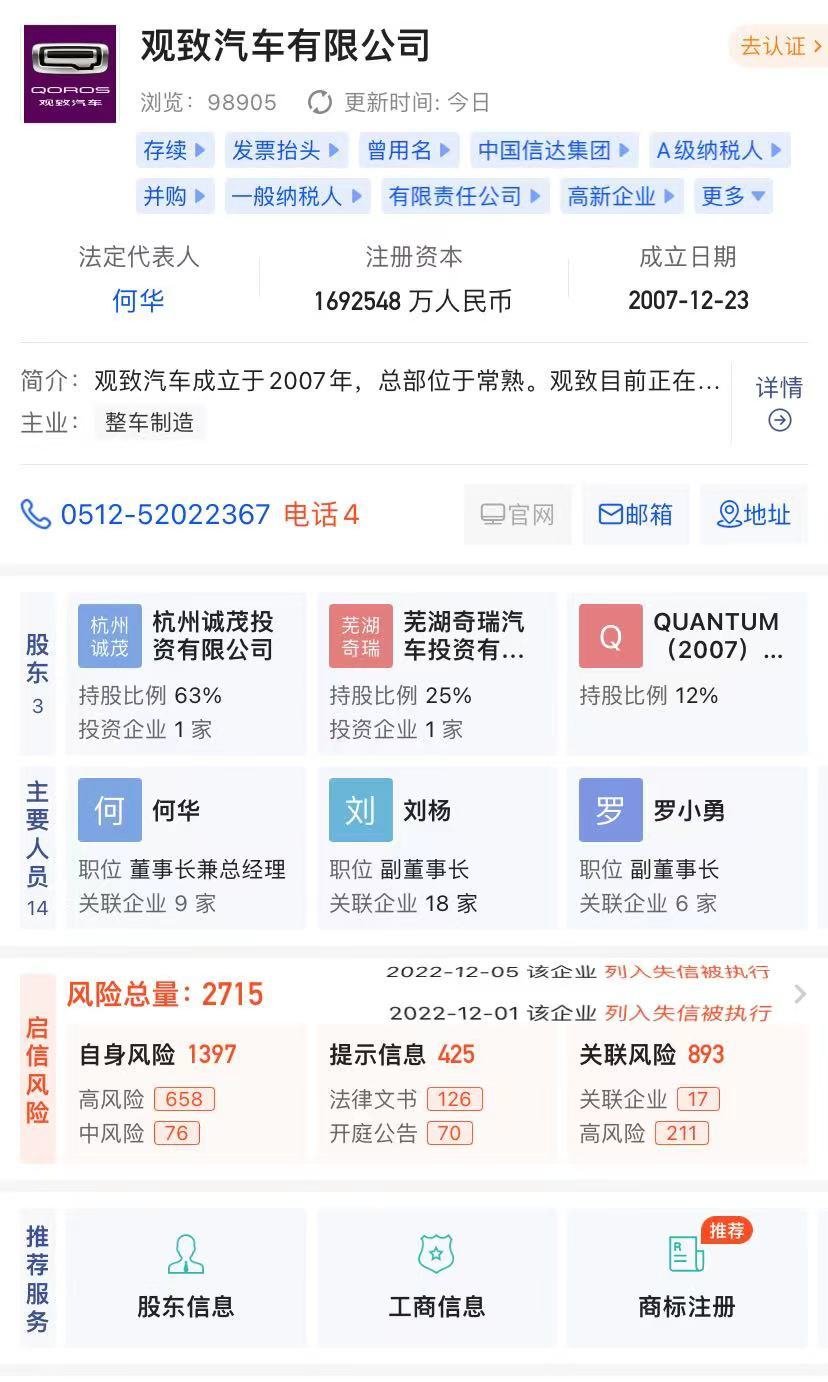 启信宝显示,截至目前,观致汽车的风险信息已经有2704条,被咸阳、广州等多地人民法院列为失信被执行人。