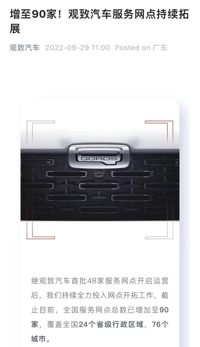 不过,观致汽车的官方微博仍在更新宣传中,最新更新时间为11月25日;观致汽车微信公众号的最后一则更新则停留在9月29日,推文中称,“观致汽车服务网点持续拓展,已经增至90家。”