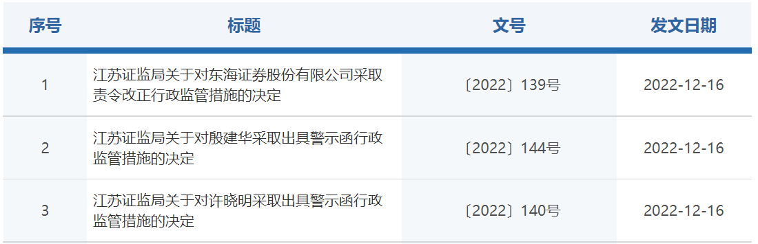 12月16日,江苏证监局连开三份罚单,就债券承销业务开展过程中治理结构不健全、内部控制不完善等问题,对东海证券采取责令改正的措施,并对东海证券时任总裁殷建华、时任债券发行部负责人许晓明出具警示函。