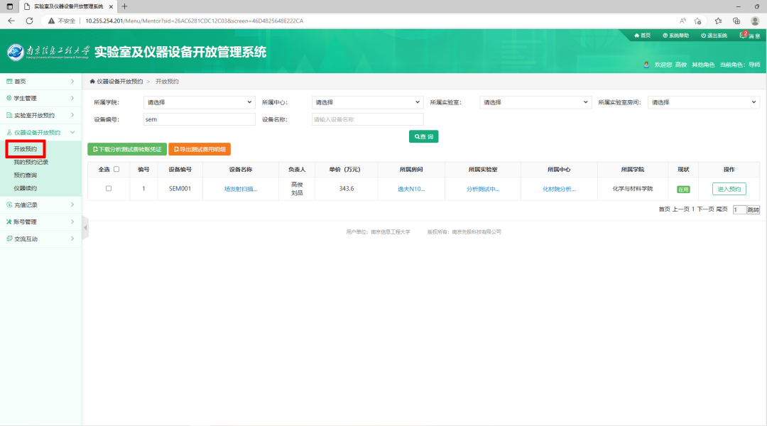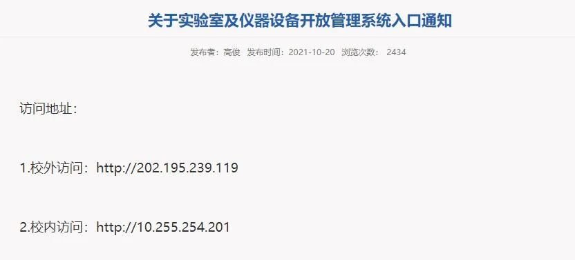 1、点击打开《关于实验室及仪器设备开放管理系统入口通知》https://schem.nuist.edu.cn/2021/1019/c6239a184210/page.htm,选择相应访问地址。