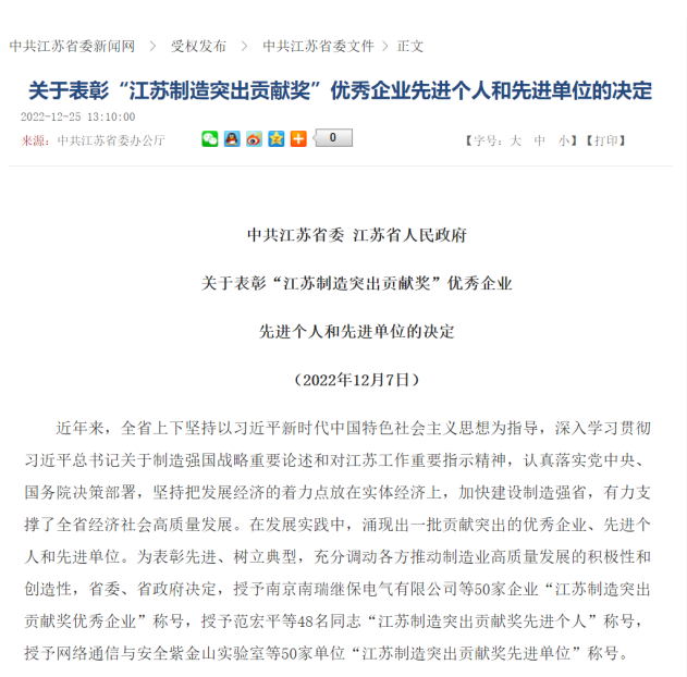 《关于表彰“江苏制造突出贡献奖”