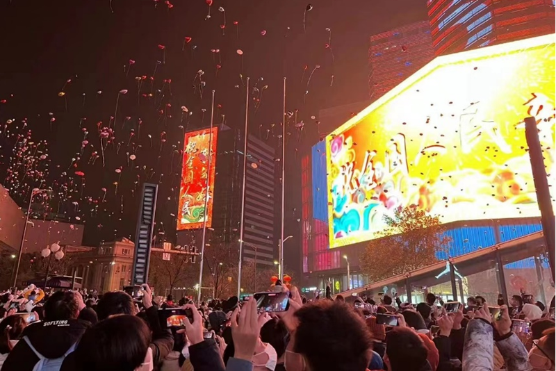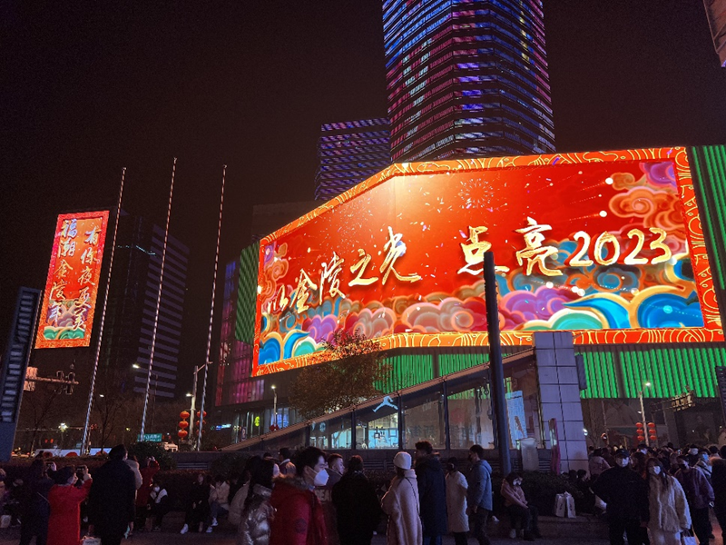 2023年1月1日0点,以金陵巨幕2688屏幕和南京天时大厦屏幕双屏联动的跨年活动,将新街口商圈打造成一座灯光璀璨的跨年舞台,营造一方流光溢彩的城市空间。