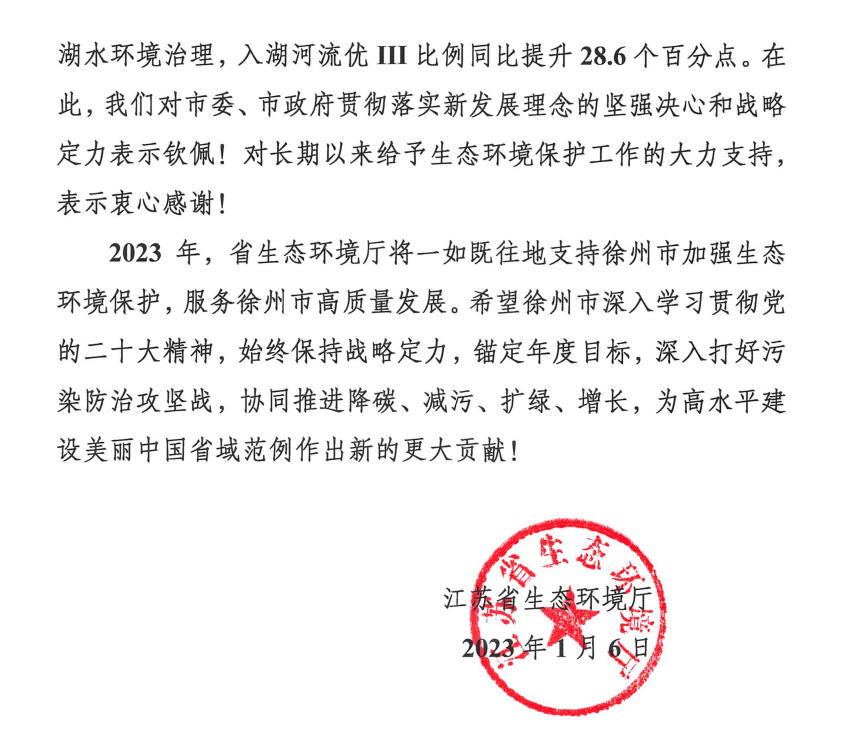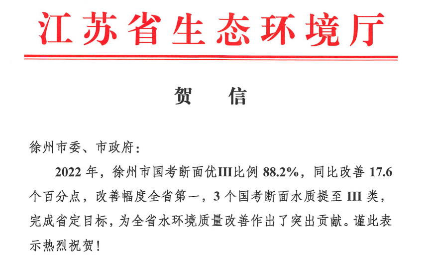 “2022年,徐州市国考断面优 III 比例88.2%,同比改善17.6个百分点,改善幅度全省第一,3个国考断面水质提至 III 类,完成省定目标,为全省水环境质量改善作出了突出贡献。谨此表示热烈祝贺!”1月6日,江苏省生态环境厅给徐州市委市政府发来贺信,对全市生态环境保护工作给予充分肯定。