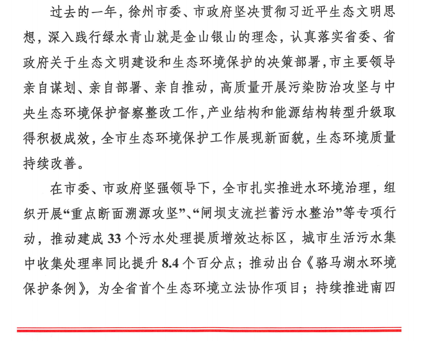 贺信中表示,在市委、市政府坚强领导下,全市扎实推进水环境治理,组织开展"重点断面溯源攻坚"、"闸坝支流拦蓄污水整治"等专项行动,推动建成33个污水处理提质增效达标区,城市生活污水集中收集处理率同比提升8.4个百分点;推动出台《骆马湖水环境保护条例》,为全省首个生态环境立法协作项目;持续推进南四湖水环境治理,入湖河流优Ⅲ比例同比提升28.6个百分点。