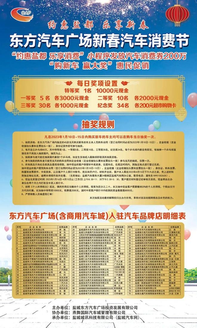 约惠盐都,乐享新春。作为 盐都区迎新春促消费的重要环节, 2023盐城东方汽车广场新春汽 车消费节促销活动强势来袭。 一月十日至十五日,凡在东方汽车广场购车客户,均可参与现金、购物卡任性抽活动,每天特等奖高达一万元。更有200万元汽车专项消费券加持,双重促销,力度空前。 梦想爱车生活,梦圆燕舞东方。